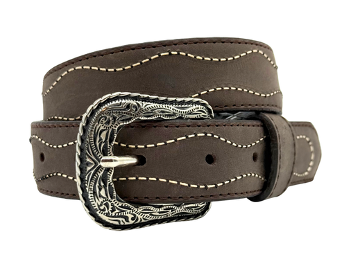 Cinturón de piel con forro de cuero recuperado, detallado con bordado lazo.